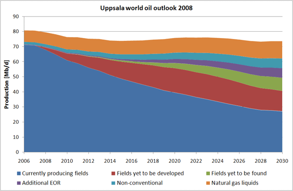 Den andra omständigheten hänger ihop med oljeproduktionen. Mycket talar för att vi nu kommit in i en peak-oil situation. I våra tidningar har skrivits om att tidigare anställda vid det internationella energiorganet IEA med säte i Paris hävdat att IEA efter påtryckningar från USA gjort och gör alltför optimistiska prognoser om framtida oljeproduktion. Detta stöds av den rapport som nyligen lämnats av en svensk forskningsgrupp under ledning av professor Kjell Aleklett i Uppsala. I den rapporten hävdas att oljetoppen nåddes år 2005 och att vi måste räkna med minskade volymer av olja framöver. I dag är världens oljekapacitet drygt 80 miljoner fat per dag. IEA räknar med att produktionen kan öka till 106 miljoner per dag 2030. I Alekletts prognos kommer inte produktionen att öka nämnvärt över 80 miljoner fat om dagen